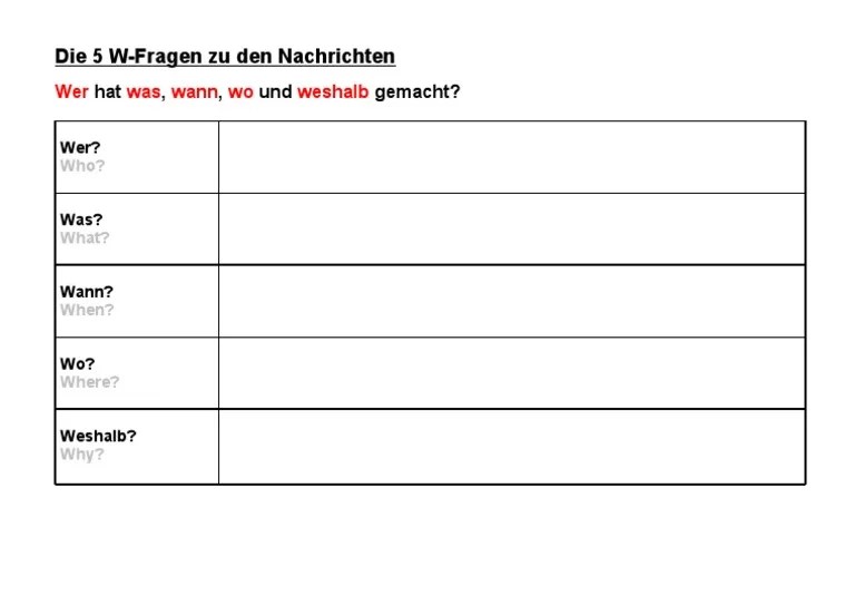 Wer? bezieht sich auf die Person oder die Personen, die beteiligt sind. Was? beschreibt den Gegenstand oder das Ereignis. Wann? gibt den Zeitpunkt an. Wo? bezeichnet den Ort des Geschehens. Warum? fragt nach dem Grund oder der Ursache.