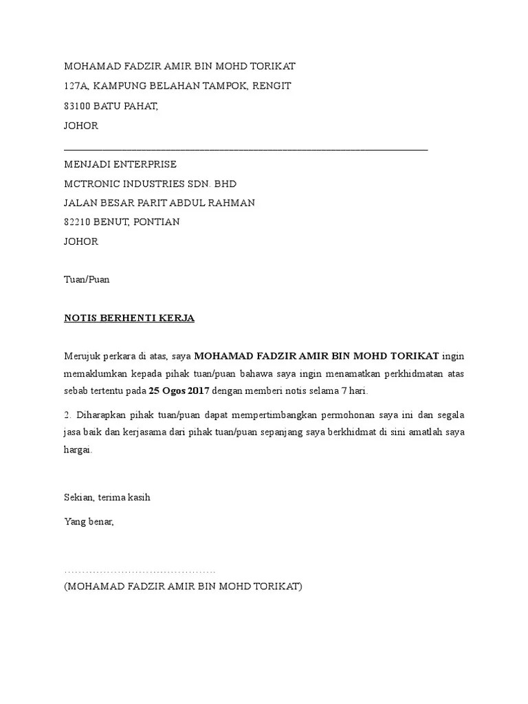 In conclusion, the one-month resignation notice (surat berhenti kerja notis sebulan) is a crucial aspect of the employment process in Malaysia. Understanding its importance, legal implications, and best practices is essential for both employees and employers. A well-managed resignation process, including adhering to the notice period and facilitating a smooth handover, fosters a positive professional relationship and ensures a seamless transition for all parties involved. By following the guidelines and best practices outlined in this article, you can navigate your departure professionally and effectively, leaving a positive lasting impression with your former employer while embarking on the next chapter of your career. Remember to always refer to your employment contract and communicate openly with your employer throughout the process. This will ensure a smooth and respectful transition for everyone involved. Take the time to prepare your resignation letter carefully and offer your assistance in training your replacement. Your professionalism during this period will be remembered, and it can be invaluable for future networking and career opportunities.